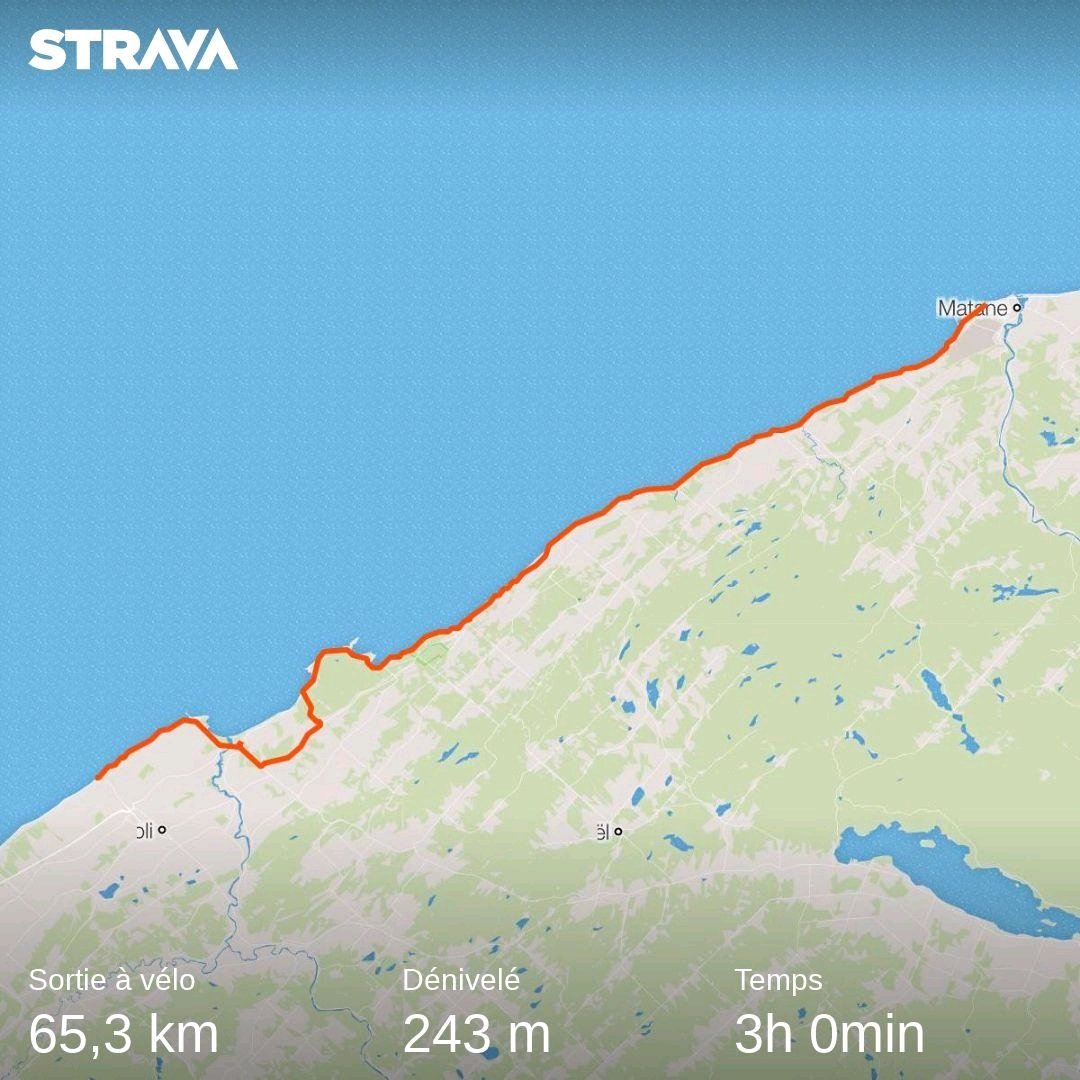 Aujourd’hui les prévisions climatiques annoncent de la pluie et des orages pour la fin de journée. Du coup, on refait tout le planning et on part sur « petite » étape de 65km en direction de Matane pour essayer de rouler au sec!