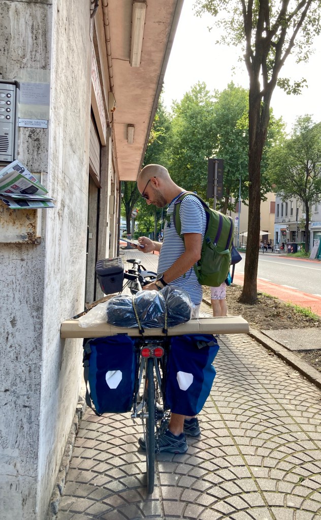 Seconde étape : récupération des housses d vélos qu’Étienne a fait livrer sur la Terre Ferme ✅