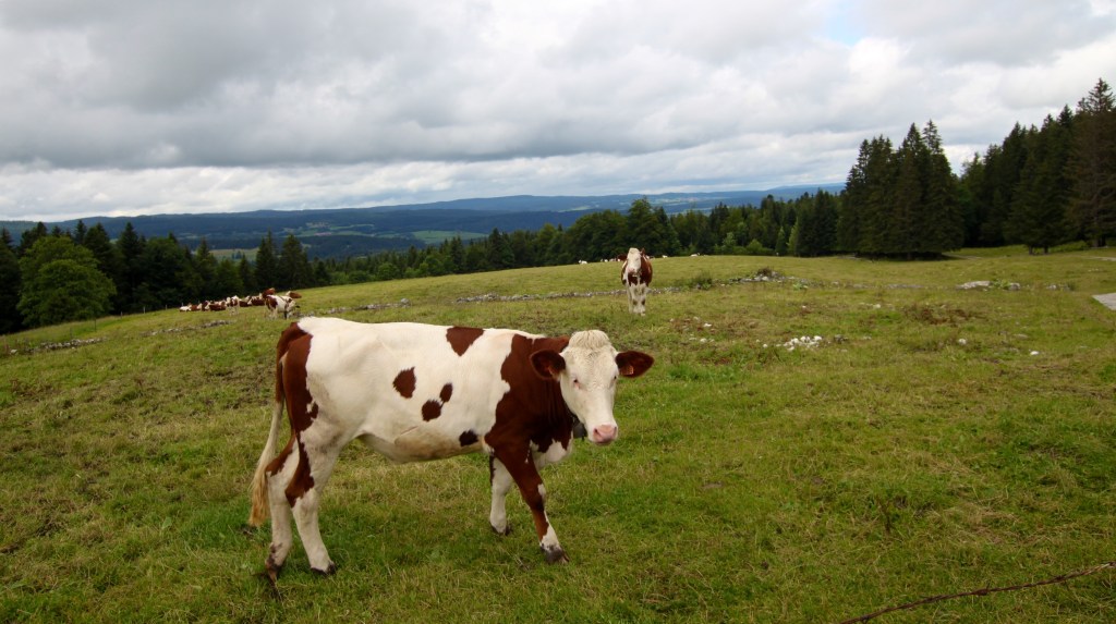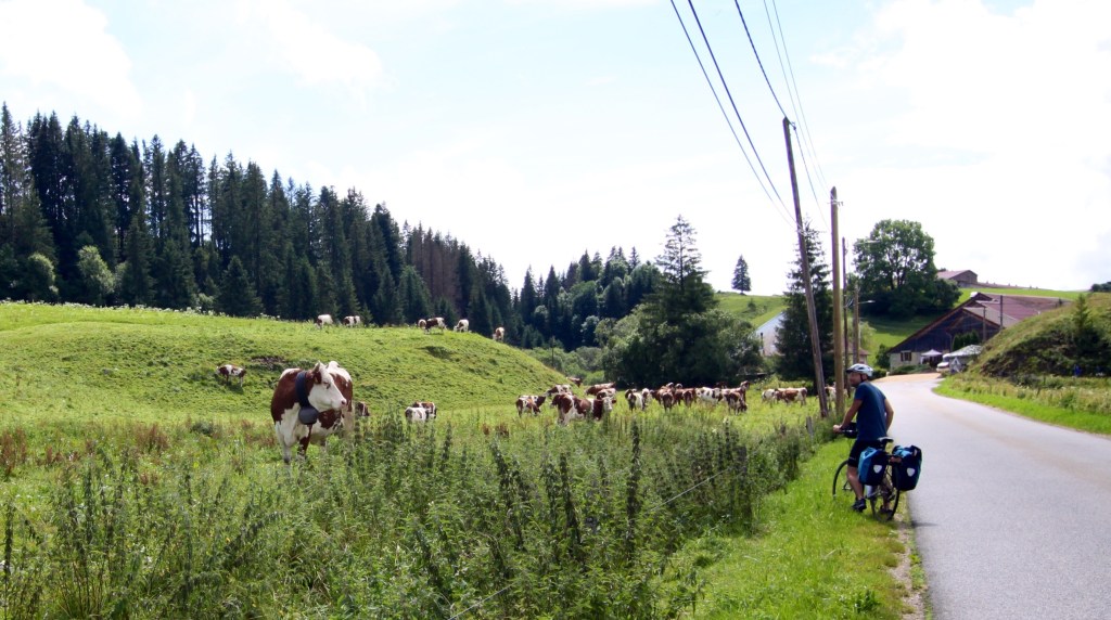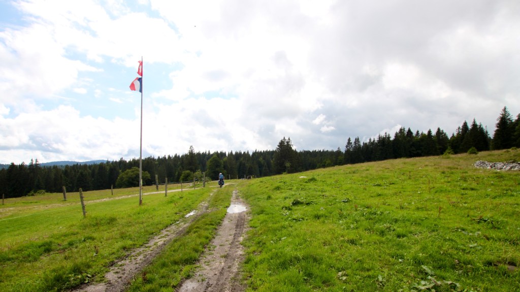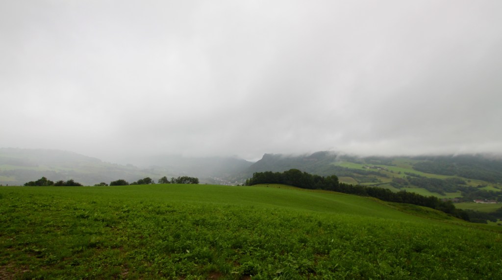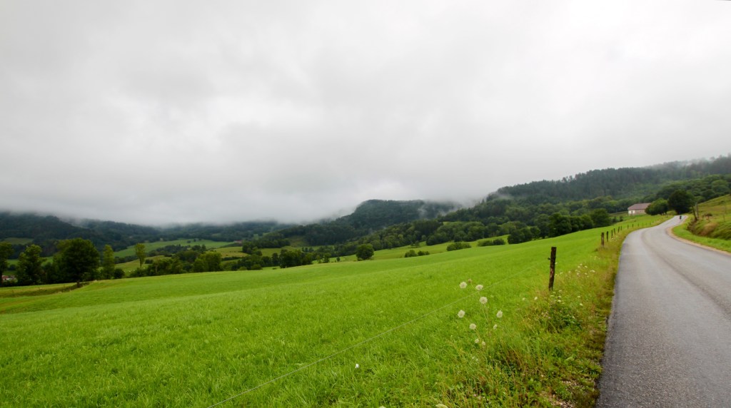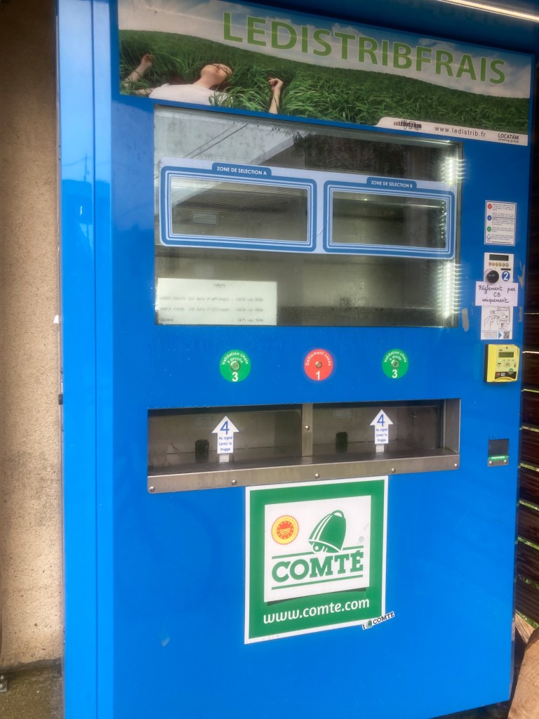 Tout d’un coup, changement de décor, on croise un village avec une place et des distributeurs. Petite pause pour voir ce que l’on peu y trouver, et la on voit qu’on est dans le Jura ! 😅