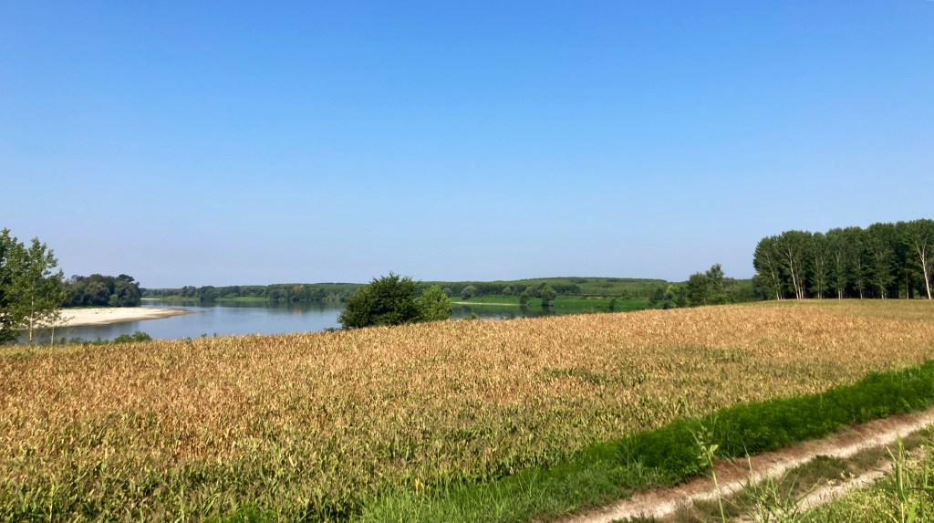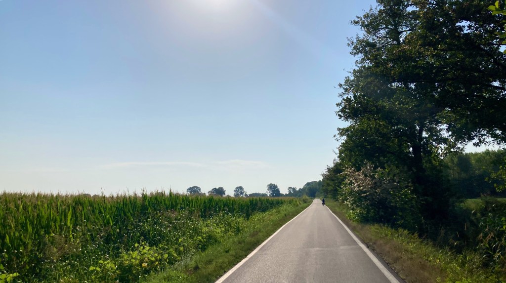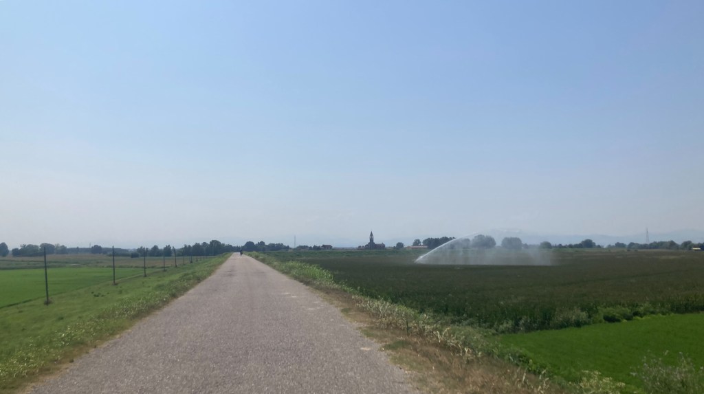 Nous rejoignons les routes et chemins sur les digues au milieu des plaines du Pô, entre blés et maïs, riz et autres plantations, la température grimpe à mesure que nous avançons.