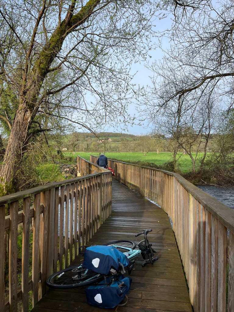 Il ne me faudra que quelques fractions pour que je me vautre sur ce joli petit pont de bois. Avec la pluie de la nuit, c’est une vraie patinoire, et c’est ainsi que je retrouve ma moitié, au sol, comme moi ☹️