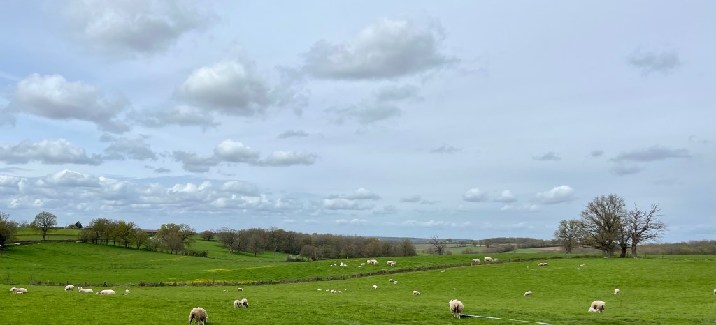 Après une matinée au fil de l’eau, l’après-midi sera à travers les terres, entre champs de céréales et prairies où paissent paisiblement vaches et moutons, avec veaux et agneaux, car visiblement c’est la saison de la mise à bas !