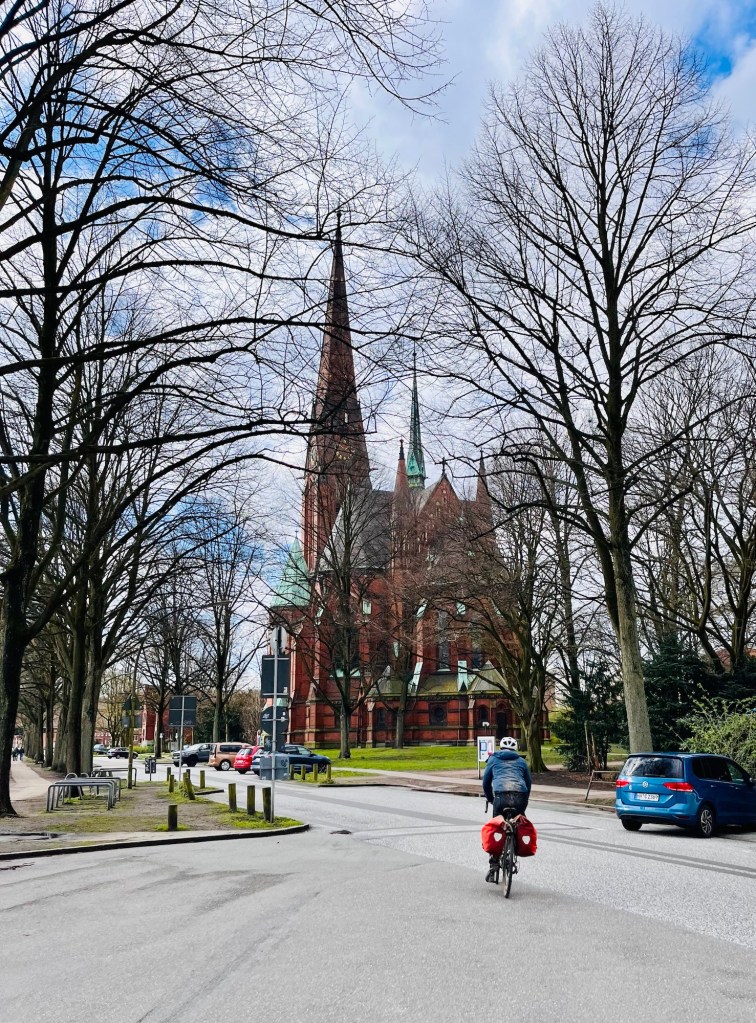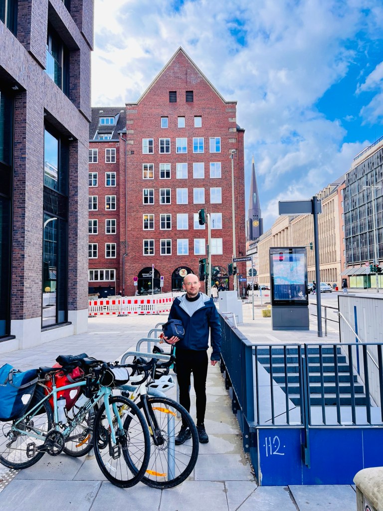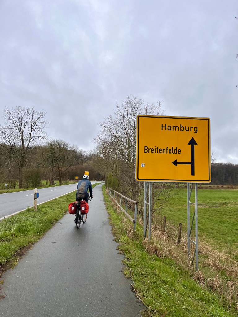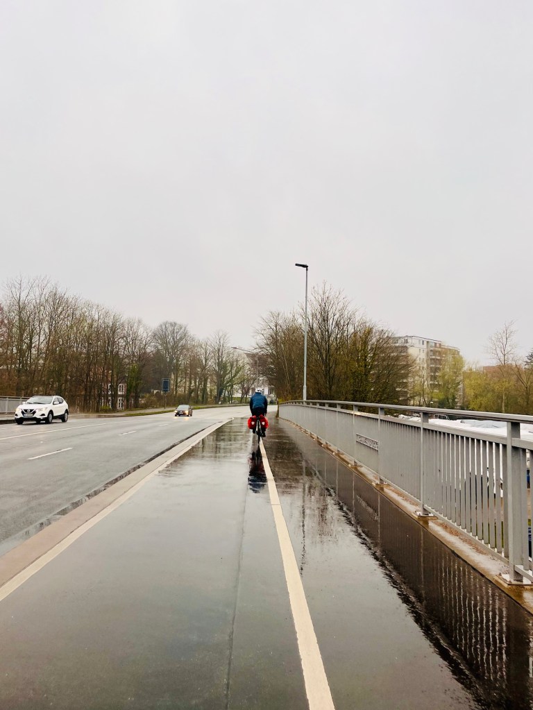 Câest avec une dĂ©termination sans faille, mĂȘme si la fatigue commence Ă se faire sentir, que nous enfourchons nos vĂ©lo en direction de Hambourg. Nous longeons des riviĂšres et canaux, croisons quelques villes, et quelques promeneurs, malgrĂ© les conditions climatiques peu favorables.