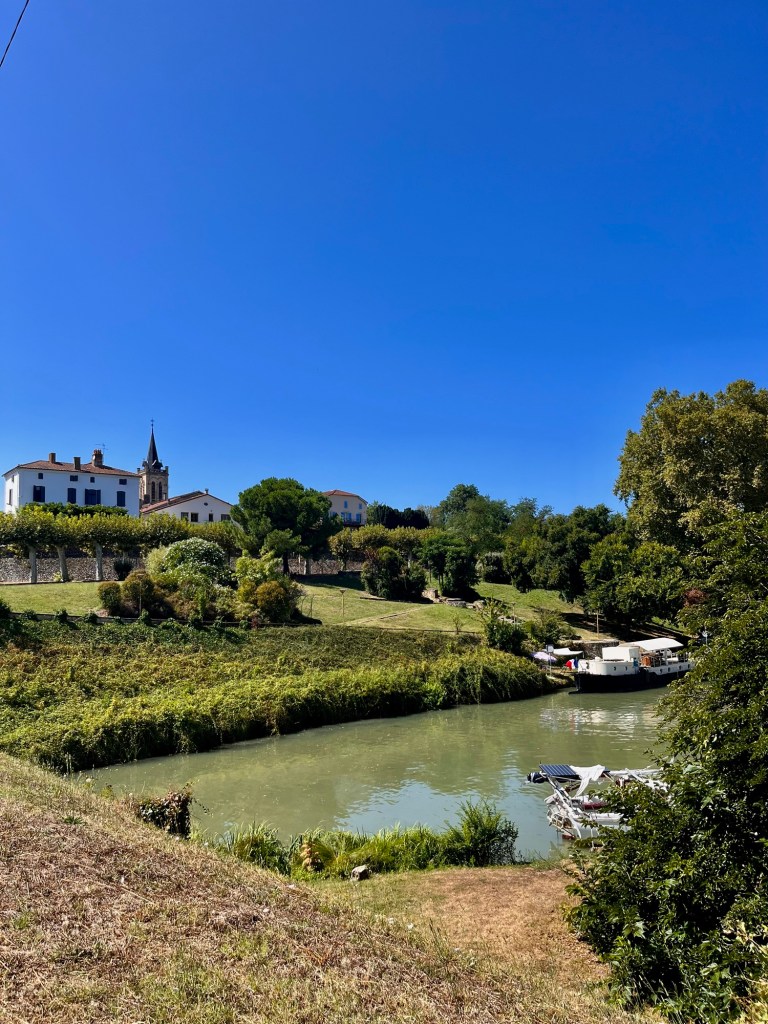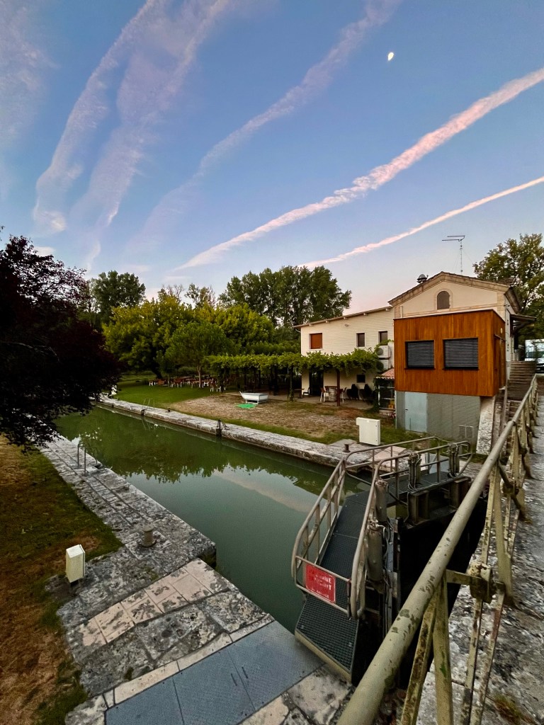 Finalement, aprĂšs 100km de route, nous arrivons Ă Buzet-sur-BaĂŻse (ne pas oublier le trĂ©ma đ€), halte pour reposer nos corps dans une vieille Ă©cluse.