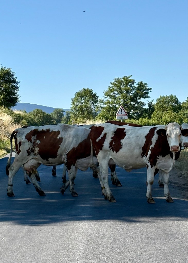 La route est calme et paisible. On fait même connaissance avec quelques vaches qui ont décidé de nous bloquer le passage.