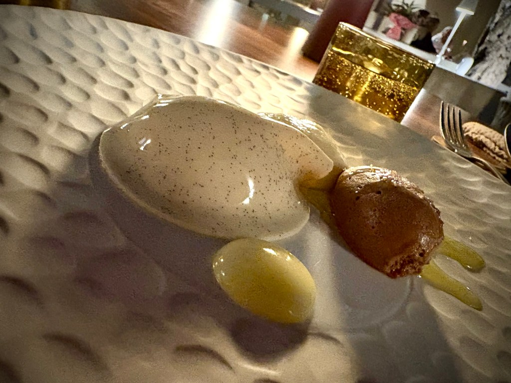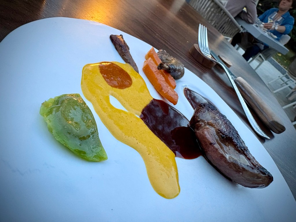 Nous dînons en terrasse, sous un olivier centenaire. Le service est adorable, et le menu découverte en huit plats (oui, il faut bien ça pour rassasier des cyclistes affamés) est tout simplement exceptionnel. Je ne vais pas tout vous détailler, mais voici notre Top 3… même si le débat reste ouvert ! 😁