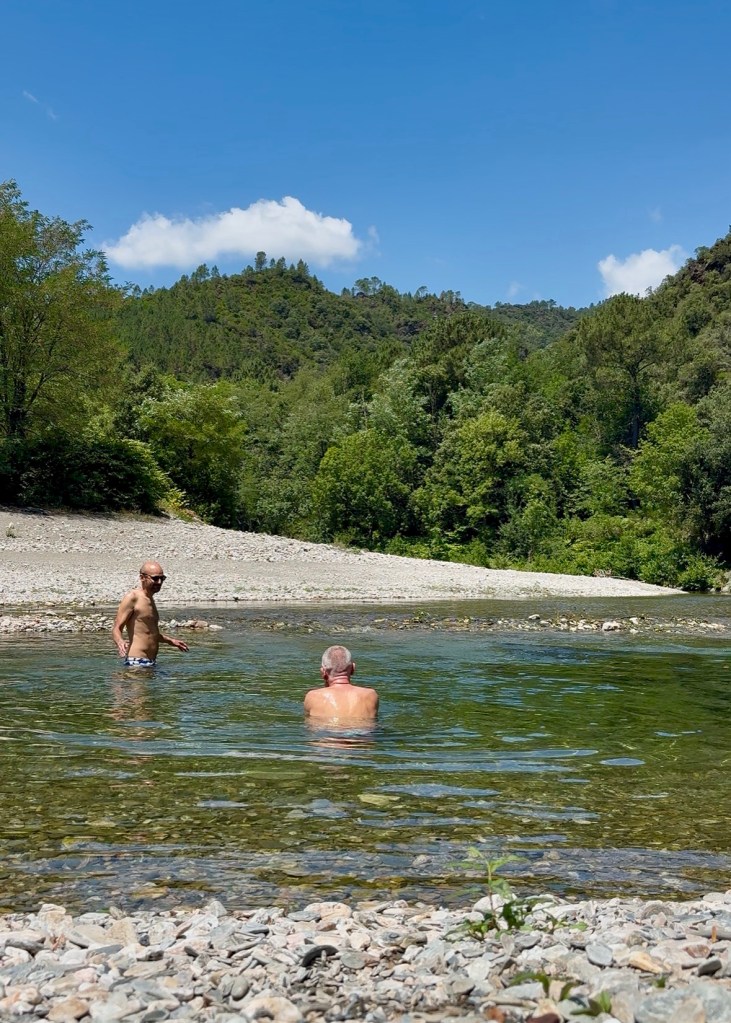 D’abord les pieds, puis, au bout de quelques minutes, je pars chercher les maillots pour une vraie baignade, tant l’eau est délicieuse. Finalement, notre pause s’étire sur plus d’une heure trente…